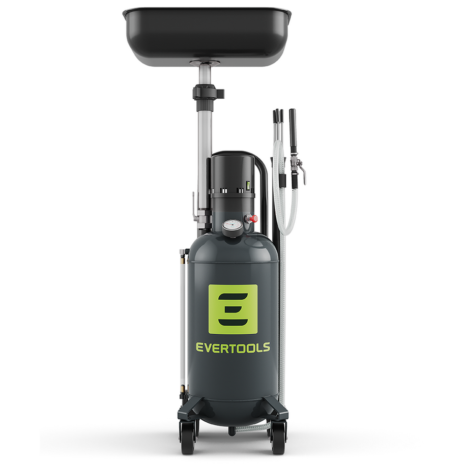 El Recolector/Extractor eléctrico de aceite EverTools CR30 ofrece los mismos beneficios que nuestro extractor SR30, con la ventaja de contar con una bandeja recolectora ajustable en altura. Se coloca debajo del vehículo tras retirar el tapón del cárter para recoger el aceite. No requiere compresor para el vaciado, ya que opera mediante presión de vacío.